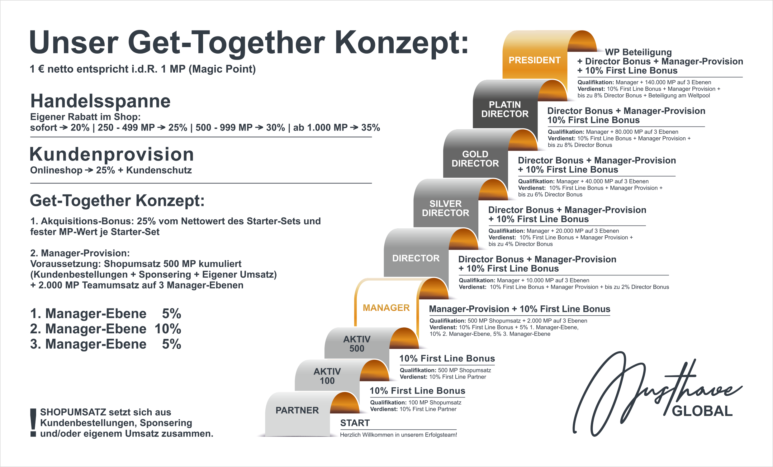 MustHave Partner, die in einem Abrechnungsmonat selber Aktivstatus – 500 MP - und 2.000 MP mit Kunden- und Eigenbestellungen sowie ihren Partnern in den 3 Manager Ebenen erreichen, sind Manager. Ein Manager erhält auf die MP der Partner und Manager seiner Downline Provisionen.